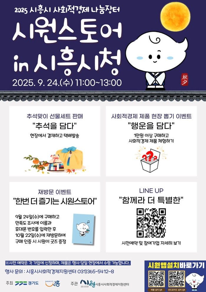 이번 시흥시 사회적경제 나눔장터 <시원스토어 in 시흥시청>에서는 수요가 높은 기존의 제품군과 추석을 맞아 준비한 곡물·떡·도라지청·비누세트 등 추석 선물세트와 색동 용돈봉투 제품도 선보일 예정이다. 당일 현장에서는 시흥시사회적경제지원센터에서 진행하는 사회적경제 제품 100% 당첨 뽑기와 재방문 이벤트도 함께 열린다.