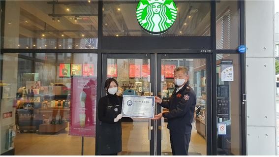 [양산=최성일 기자] 양산소방서(서장 박승제)는 지난 29일 ‘2022년 다중이용업 안전관리 우수업소’로 최종 선정된 ‘스타벅스 양산가촌점(야리로 25), 브라더골프(백호로 60)를 방문해 안전관리 우수업소 인증 표지를 전달하였다고 30일 밝혔다.