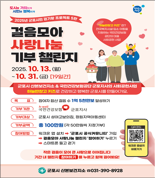 ‘걸음모아 사랑나눔’ 기부챌린지는 2023년부터 군포시와 국민건강보험공단 군포지사가 협력해 추진해 온 사회공헌형 걷기 사업이다. 시민들이 일상 속에서 걸음을 모아 목표를 달성하면 이를 기부로 연계해 취약계층에 전달하는 방식으로 진행되며 시민과 지역 내 기업·단체가 함께 참여해 건강한 나눔 문화를 지역사회에 확산시키고 있다.