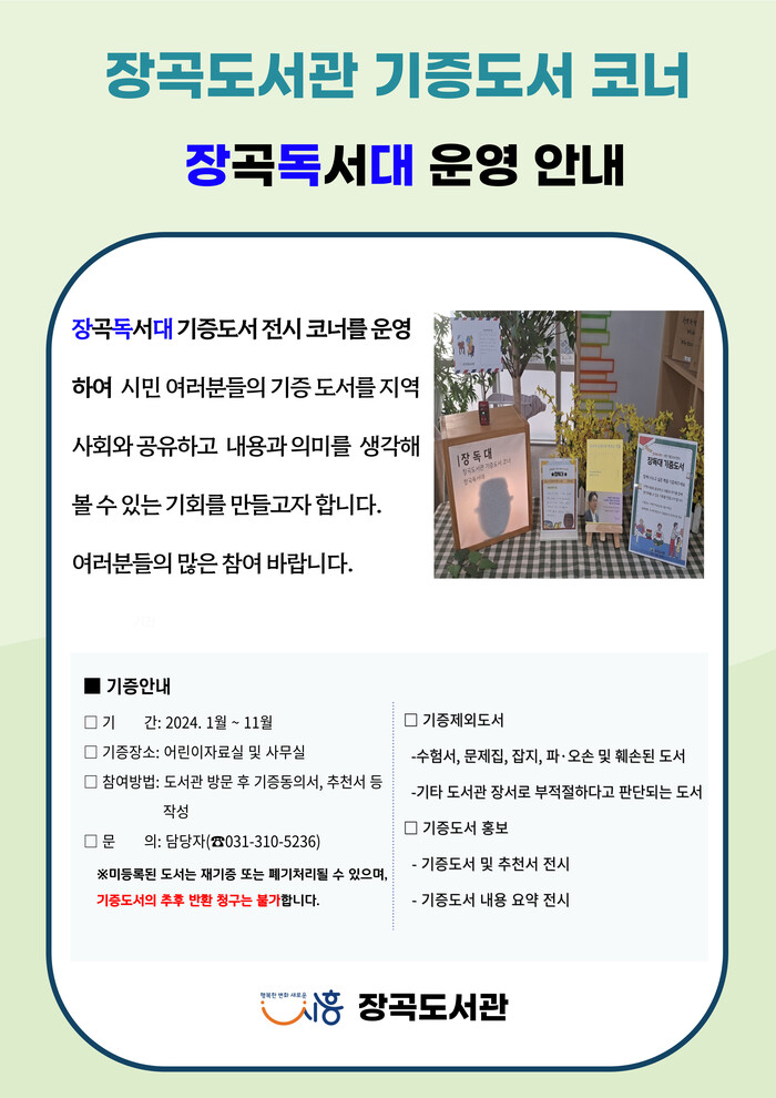 도서 기증을 희망하는 시민은 시흥시도서관 누리집 소식란을 참고해 기증하거나, 장곡도서관으로 문의하면 기증 안내를 받을 수 있다.
