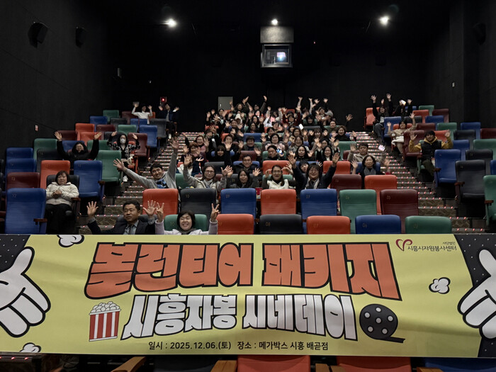 행사는 올 한 해 봉사활동 성과를 되돌아보는 감사 메시지 전달에 이어 영화 관람 순으로 진행됐다. 상영작은 ‘한란’으로, 어려운 시대 속에서도 서로를 지키기 위한 연대와 헌신의 메시지를 담아 자원봉사의 가치와 맞닿아 있는 작품으로 선정됐다. 시흥시자원봉사센터 할인가맹점 메가박스 시흥 배곧점 상영관 1개 관을 대관해 운영된 이번 프로그램은 영화관을 가득 채운 봉사자들이 주인공이 되는 문화 행사로 꾸며졌다.