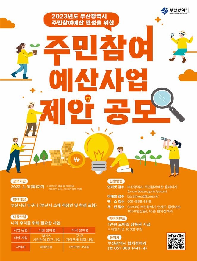 부산시(시장 박형준)는 내년도 예산편성을 위해 주민참여예산에 반영할 사업을 3월 31일까지 접수한다고 밝혔다.