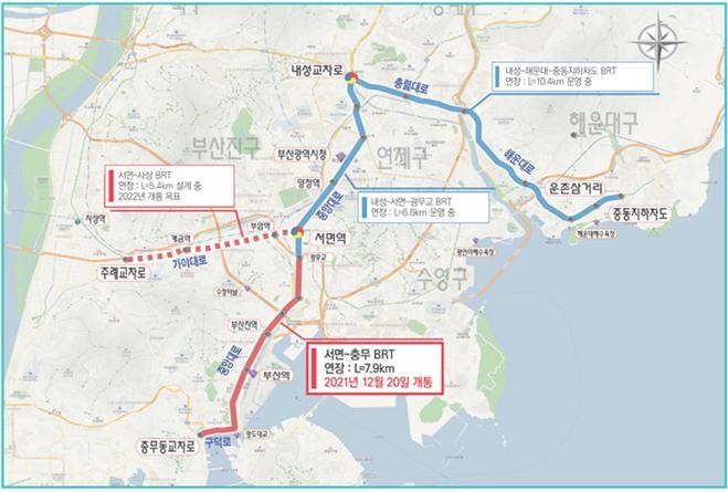 또한, BRT 개통과 함께 서면복개로, 고관로 등을 운행하는 시내버스 21개 노선도 조정해, 버스의 정시성과 속도를 더욱 높이고 일반차량의 교통흐름도 원활하게 한다.