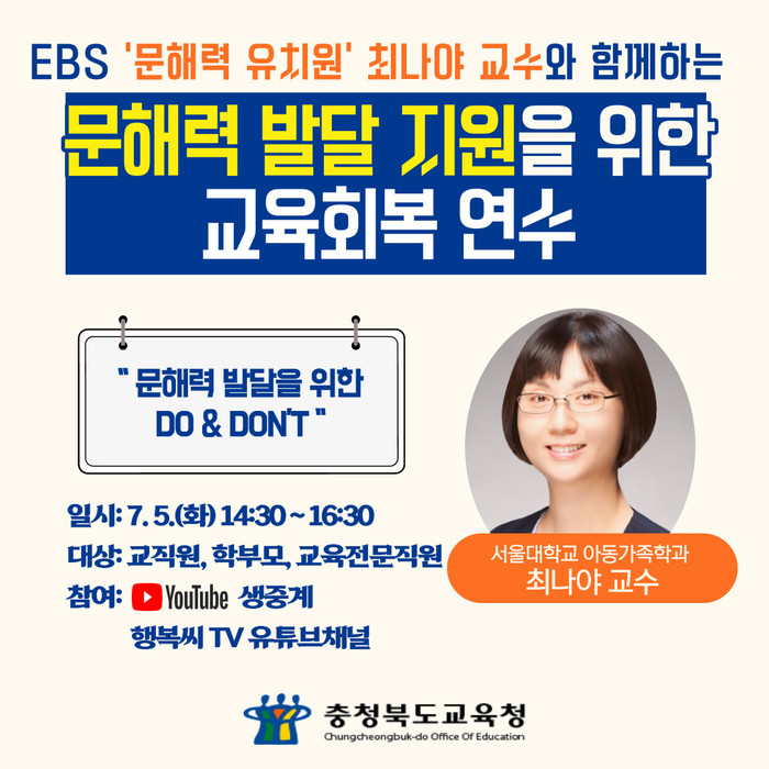 [청주=엄기동 기자]충청북도교육청은 교육회복을 위한 교육공동체 역량 강화의 방안으로 7월 5일(화) 14시 30분에 ‘문해력 발달 지원을 위한 교육회복 연수’를 진행한다.