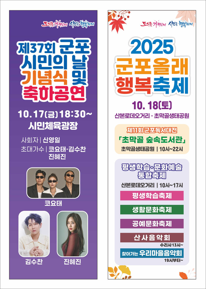 2025 군포올래행복축제는 10월 17일 금요일부터 시민체육광장에서 아나운서 신영일의 사회로 코요태, 김수찬, 진해진 등 유명가수의 출연 및 지역예술인의 댄스 퍼포먼스와 환상적인 불꽃쇼로 시민들에게 행복한 시간을 선물한다.