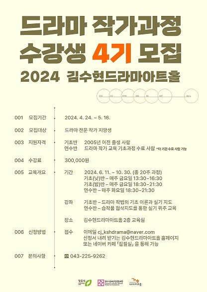청주시문화산업진흥재단(대표이사 변광섭)이 운영하는 국내 유일의 드라마문학관 김수현드라마아트홀(이하 드라마아트홀)이 오는 24일부터 내달 16일까지 ‘드라마작가 과정’ 4기 수강생을 모집한다고 밝혔다.