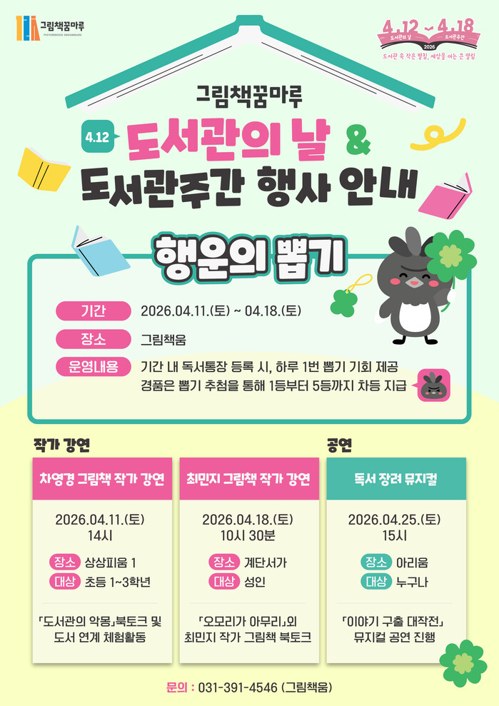 도서관 주간(4월 11일~18일) 동안 그림책꿈마루에서는 ▲작가와의 만남 ▲행운의 뽑기 ▲독서 장려 뮤지컬 공연과 같이 다양한 프로그램이 진행된다.