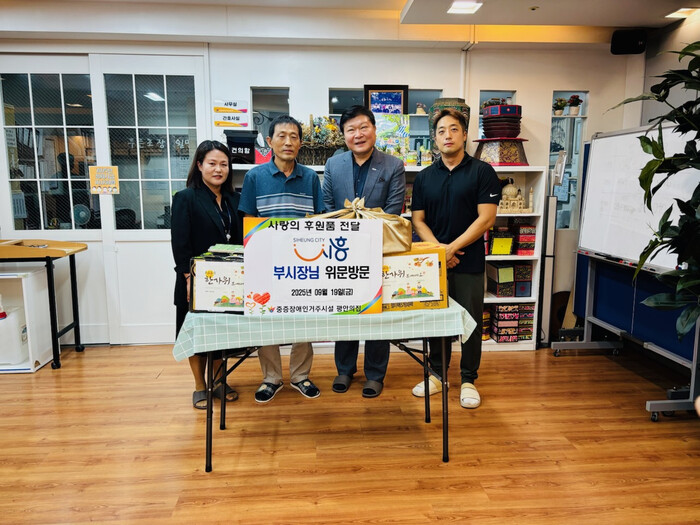 | ▲ 박승삼 시흥시 부시장(사진 왼쪽부터 세 번째)은 추석을 맞아 지난 9월 19일 중증장애인 거주시설인 ‘평안의집’을 방문해 위문품을 전달했다 /사진제공=시흥시 |