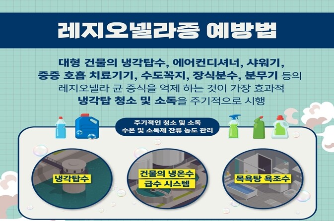 보건소 관계자는 “다중이용시설의 급수시설이 레지오넬라균으로 오염되는 경우 레지오넬라증의 집단 발병 원인이 될 수 있다”며 “예방을 위하여 급수시설 등을 청소하고 소독 조치를 해 줄 것”을 당부했다.