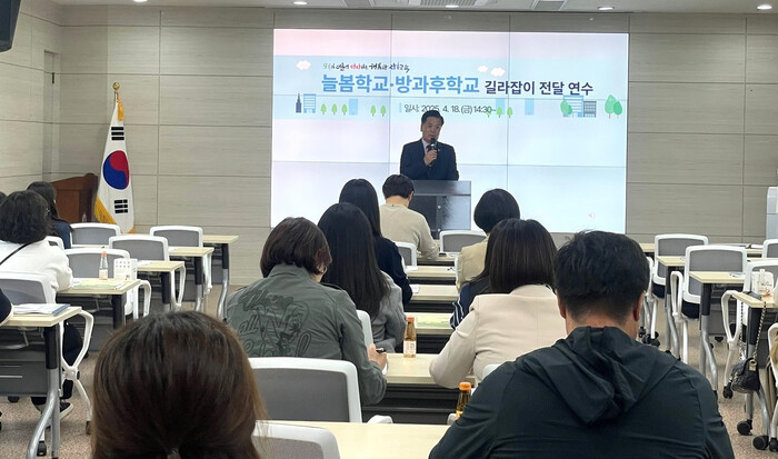 연수는 관내 초·중·고등학교의 교감, 방과후학교 담당자, 늘봄실무사를 대상으로 진행됐으며, ‘2025년 늘봄학교 및 중등 방과후학교 운영 길라잡이’를 중심으로 운영 매뉴얼과 사례를 설명하고, 현장 적용 방안을 제시했다. 이어 자유수강권 운영 지침과 청렴교육도 함께 진행됐다.