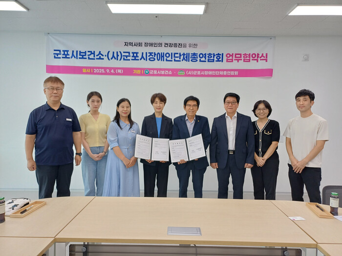 | ▲ 군포시보건소는 지난 4일 (사)군포시장애인단체총연합회와 함께 지역사회 장애인의 건강증진과 삶의 질 향상을 위한 상호 협력을 약속하는 업무협약을 체결한 뒤 관계자들이 기념 촬영을 하고 잇다 /사진제공=군포시 |