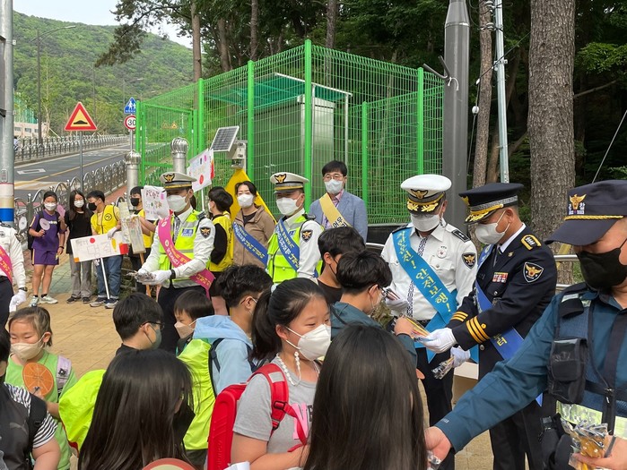 또 스쿨존 내 불법 주·정차, 과속 등 법규위반 차량에 대해 단속 및 계도와 등교하는 학생들을 대상으로 올바른 보행문화 정착을 위해 방어보행 3원칙이 적힌 포돌이·포순이 연필도 배부하였다.