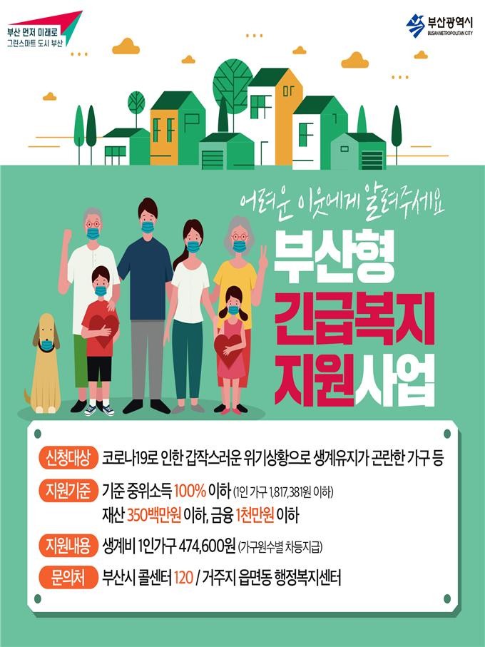 부산형 긴급복지지원 사업은 새로운 복지 혁신을 위한 박형준 부산시장의 공약사업으로 법정 지원 밖에 놓인 위기가구를 신속하게 지원하는 사업이다. 이는 정부 긴급복지 사업보다 선정기준을 완화하여 복지 사각지대를 지원하는 최후의 안전장치로서 작동하고 있다.