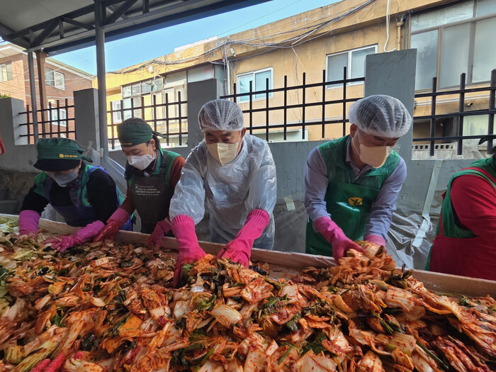 | ▲ 군포시 군포1동새마을지도자협의회와 군포1동새마을부녀회는 군포1동행정복지센터 앞마당에서 ‘2025년 사랑담은 김장김치 담그기’행사를 진행하고 있다 /사진제공=군포시 |