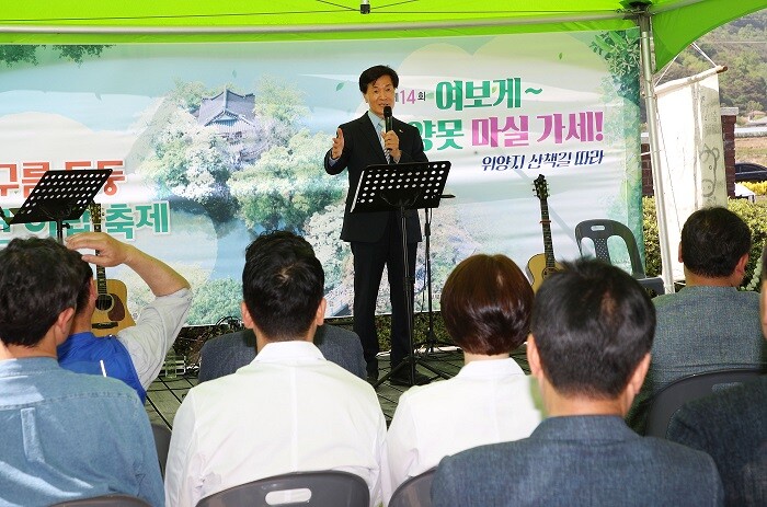 | ▲ 행사에 참여해 주민과 관광객에게 인사말을 하고 있는안병구밀양시장 |