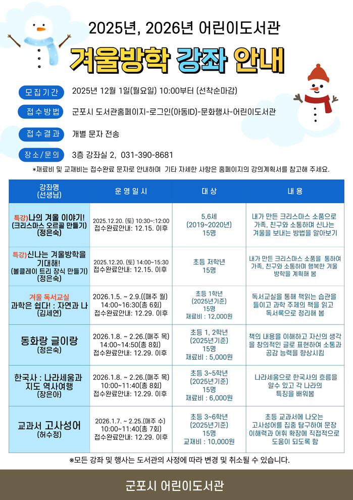 | ▲ 군포어린이도서관 26년 겨울방학 프로그램 안내 포스터 /자료제공=군포시 |