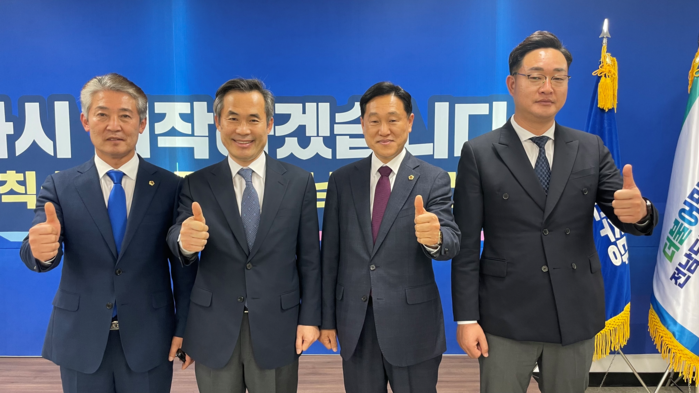 | ▲ 전경선 수석대변인(죄측), 김승남 도당위원장(좌 두번째), 강문성 의원(여수3).나광국(우측). |