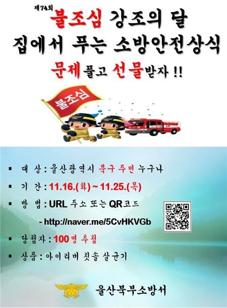울산 북부소방서(서장 박용래)는 11월 불조심 강조의 달을 맞아 오는 25일까지 비대면 119안전문화 퀴즈쇼를 개최한다고 밝혔다.