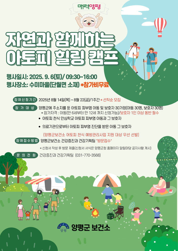참가 대상은 양평군에 주민등록이 되어 있고, 아토피피부염 진단을 받은 만 6세부터 12세까지의 아동으로, 보호자 1인과 반드시 함께 참여해야 한다. 신청자 중에서는 양평군보건소 아토피·천식 예방관리사업 등록자가 우선 선발된다.