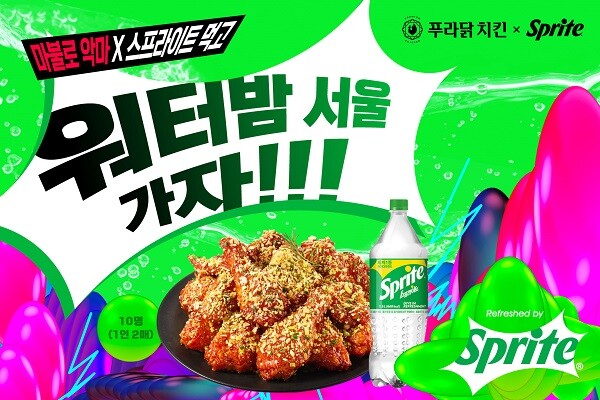 이벤트는 오는 6월 6일까지 9일간 '푸라닭 치킨 전용앱'에서 진행되며, '마불로 X 스프라이트 세트'메뉴 구매 시 자동 응모된다. 당첨자는 만 19세 이상 이벤트 메뉴 구매 응모자 중 추첨을 통해 10명을 선정하며, 당첨자에게는 ‘2023 워터밤 서울 by 스프라이트’ 티켓이 1인 2매씩 증정된다.