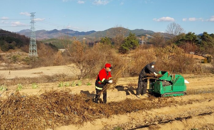 이 사업은 깻대, 고춧대, 콩대 등 영농활동 후 발생하는 부산물을 대신 파쇄해 준다.