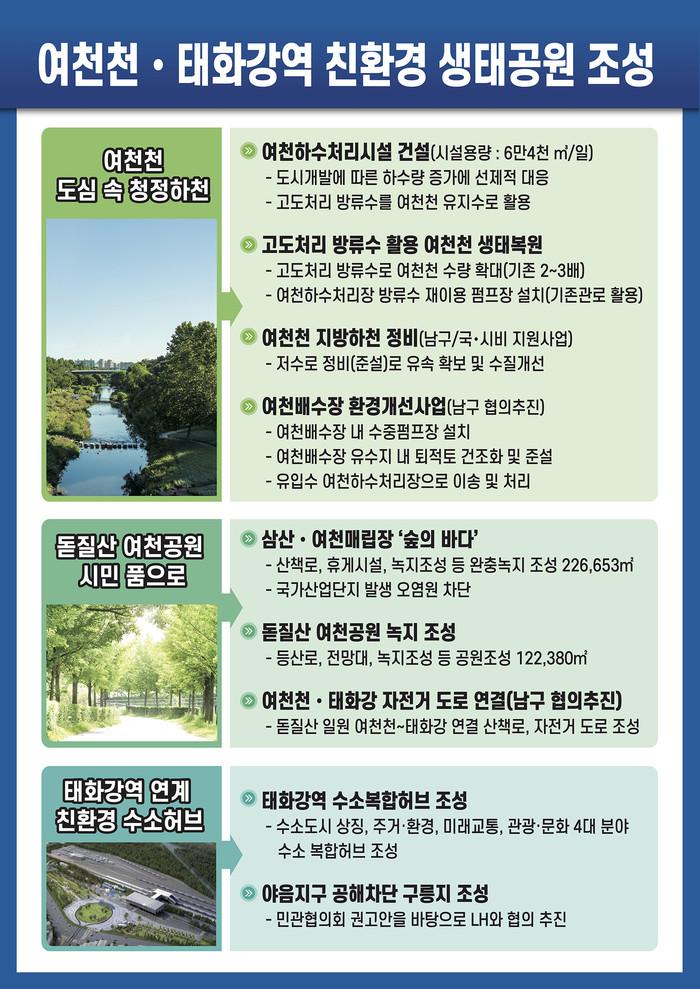 그간 대한민국의 산업수도 울산이 미처 챙기지 못했던 여천천과 삼산⸱여천매립장, 돋질산 일원을 다시 자연이 살아 숨쉬고 시민이 즐길 수 있는 친환경 공간으로 조성한다는 계획이다.