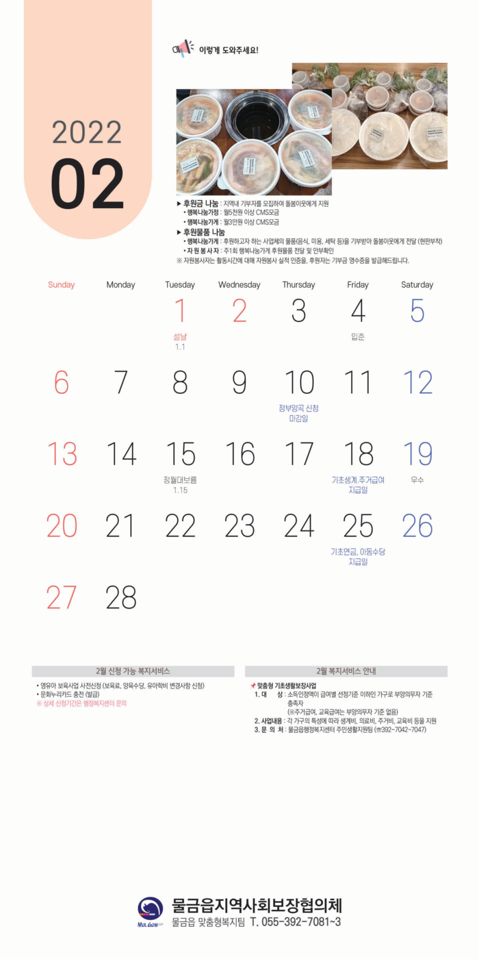 양산시 물금읍 지역사회보장협의체(공동위원장 김옥랑·정상태)는 2022년 새해를 맞아 돌봄이웃을 위해 복지정보를 담은 달력을 제작해 관내 취약계층, 경로당, 다중이용시설 등에 전달하고 행정복지센터를 내방하는 주민들에게 배부한다고 밝혔다.