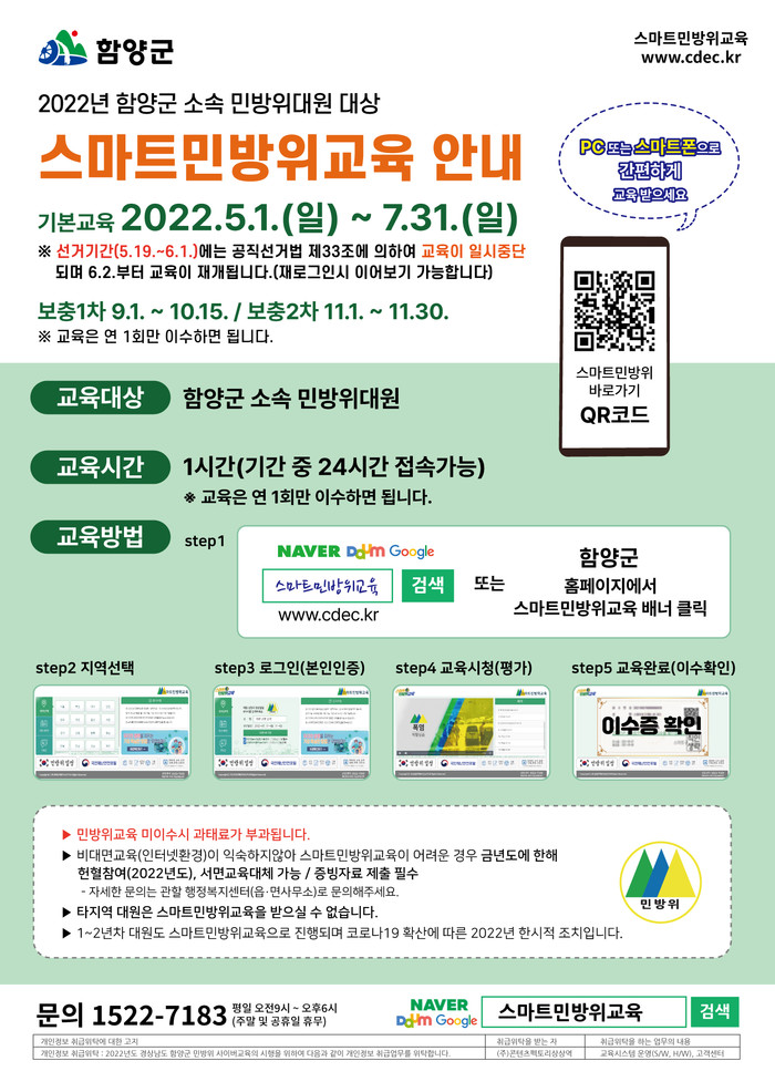 교육 사이트는 함양군청 홈페이지의 팝업존에 있는 스마트 민방위교육을 클릭하거나 네이버, 다음, 구글 등에서 ‘스마트민방위교육’을 검색해 접속하면 된다.