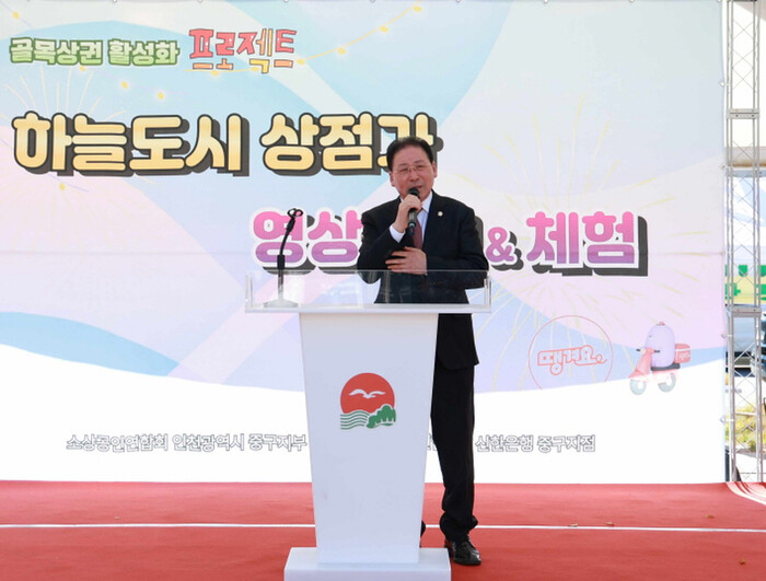 | 강후공 의원이 ‘영종하늘도시 상점가 영상 투어·체험 행사’에 참석, 축사를 하고 있다. (사진=중구의회) |