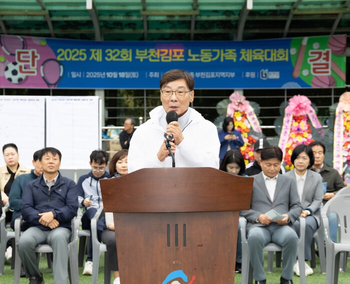 | 김병전 의장이 부천김포 노동 가족 체육대회에 참석, 축사를 하고 있다. (사진=부천시의회) |