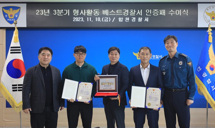 합천경찰서 형사팀은 2023년 3분기 동안 차량절도, 방화 등 강력범죄 및 마약 범죄 사범 검거 등에서 우수한 형사활동을 전개하여 도내 경찰서 중 최고의 팀으로 선정되었으며, 수사심사관 또한 장기사건 및 보완수사 자료분석, 현행범·긴급체포 사례 분석 및 수사서류 작성 기법 사례 공유하고 전 수사관 대상 심사·지도하는 등 수사심사관 제도를 적극 운영한 공로로 베스트 심사관에 선정되었다.