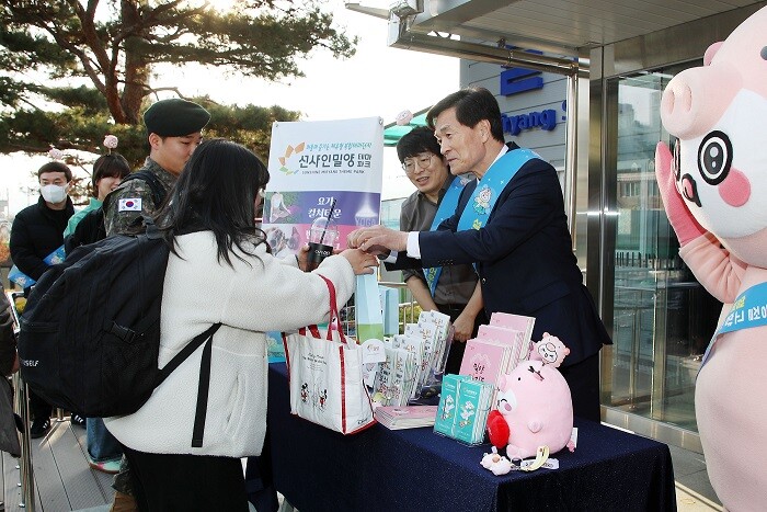 이날 안병구 밀양시장과 민기영 밀양역장을 비롯한 관계자들은 밀양의 대표 캐릭터인 굿바비와 함께 밀양역을 방문하는 귀성객과 관광객에게 설맞이 인사와 함께 밀양 관광 홍보물을 배부했다.