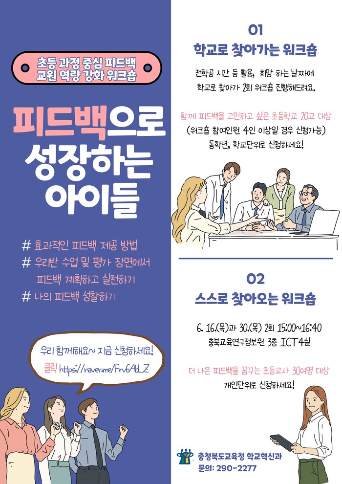 ‘스스로 찾아오는 피드백 워크숍’은 피드백을 개인적으로 희망한 교사 총 11명이 충북교육연구정보원에서 모여 6월 16일(목), 30일(목)에 2회로 운영된다.