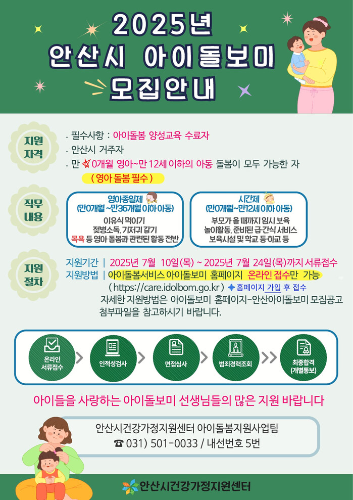 지원은 10일부터 24일까지 아이돌봄서비스 아이돌보미 누리집에서만 온라인으로 접수 가능하다. 안산시에 거주하고 만 0개월 영아부터 만 12세 이하의 아동 돌봄이 가능한 몸과 마음이 건강한 사람은 누구나 지원할 수 있다. 다만, 아이돌봄 양성교육을 수료해야 지원이 가능하다.