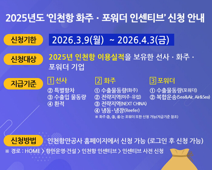 이번 인센티브는 2025년 인천항 물동량 실적을 기준으로 지급되며 2026년 예산 총 26억 원을 확보, 인천항만공사 17억 원과 인천시 9억 원을 공동 투입, 지급할 예정이다.