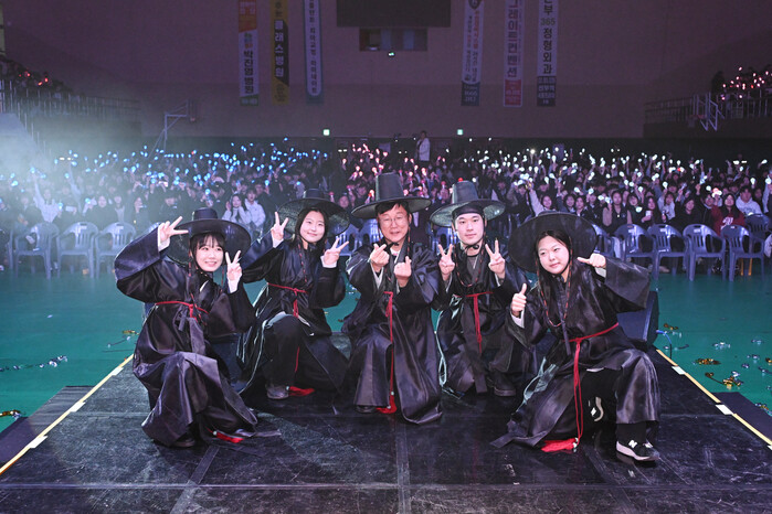 | ▲ 이민근 안산시장(가운데)이 27일 안산올림픽기념관에서 열린 ‘2025 안산시 고3 힐링타임’ 행사에서 깜짝 이벤트로 ‘데몬헌터스’ 복장을 입고 학생들과 함께 퍼포먼스를 선보이고 있다 /사진제공=안산시 |