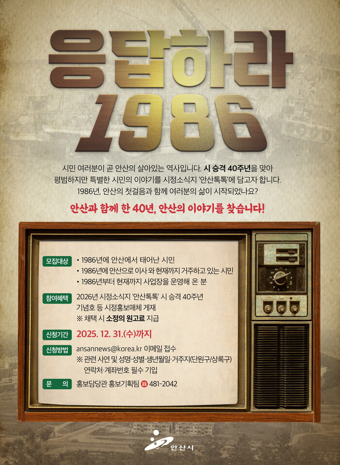 이번 사연 모집은 시 승격 40주년을 기념해 ‘시민이 곧 안산의 살아있는 역사’라는 취지로 마련됐다. 안산의 성장과 변화 속에서 도시를 지탱해 온 시민들의 일상과 경험을 시정 소식지 ‘안산톡톡’에 담을 예정이다.