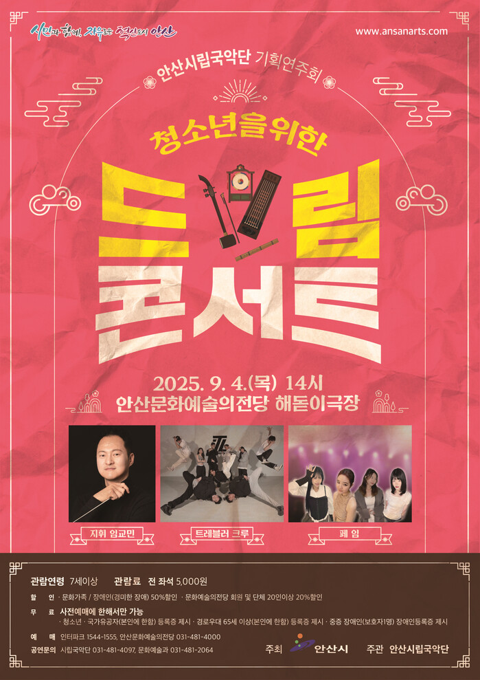 이선희 문화체육관광국장은 “안산시립국악단의 첫 청소년 기획 공연인 만큼, 많은 학생이 방문해 힐링하고, 새로운 국악의 매력을 느낄 수 있는 계기가 되길 기대한다”고 말했다.