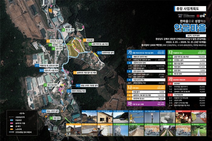 이번에 선정된 생림면 안금마을은 주변에 무분별하게 조성된 공장들로 인해 좁은 마을 안길의 대형트럭 통행이 잦아 보행 안전이 위협받고 있고 소음과 악취 등으로 주민간의 갈등이 깊어지고 있어 ‘한마음으로 성장하는 안금마을’을 비전으로 생활도로 인프라 개선, 마을 포켓주차장 조성, 다목적커뮤니티시설 조성, 방범 스마트 가로등, 주택수리, 슬레이트지붕 개량, 빈집철거 등에 16억원을 투입하여 주거환경을 개선하고 주민주도의 사업추진능력을 길러 주민자치형 지역발전 기반을 구축할 계획이다.