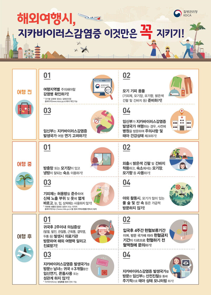 특히, 시는 미주와 동남아시아, 서태평양, 아프리카, 유럽 등 92개 국가가 지카바이러스 위험국가인 만큼 관련 국가를 방문할 때 ▲풀숲 및 산속 피하기 ▲밝은색 긴 옷 착용하기 ▲모기기피제 사용하기 ▲모기장 사용하기 등의 예방 수칙을 준수할 것을 당부했다.