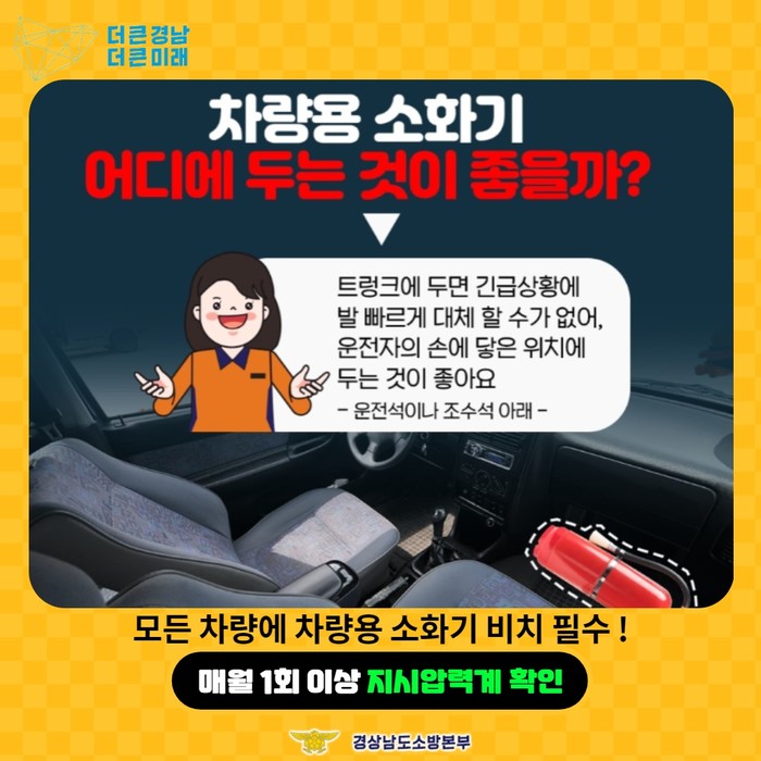 [양산=최성일 기자] 양산소방서(서장 박정미)는 차량 화재 발생 시 빠른 화재 진압을 위해 차량용 소화기 비치를 당부한다고 밝혔다.