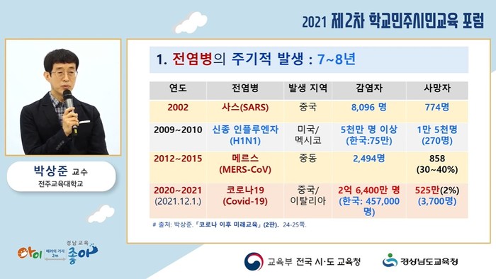 [창원=김점영 기자] 교육부와 전국 시·도교육청이 공동 주최하고 경상남도교육청(교육감 박종훈)이 주관한 ‘2021 제2차 학교 민주시민교육 포럼’이 지난 10일 온라인으로 열렸다.