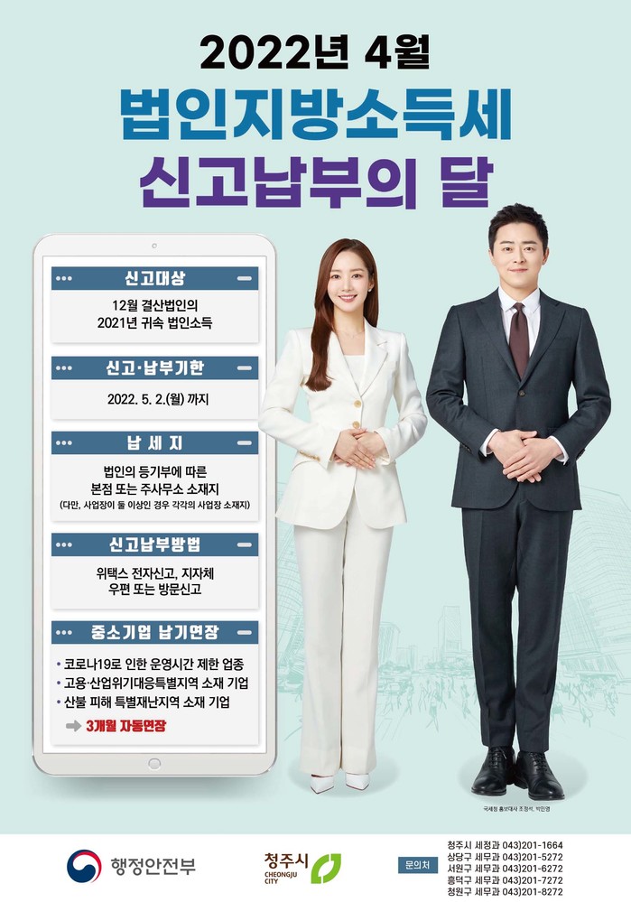 청주시 지역 내 사업장을 둔 법인은 5월 2일까지 사업장 소재지 관할 구청 또는 위택스 전자신고로 법인지방소득세를 신고·납부해야한다.
