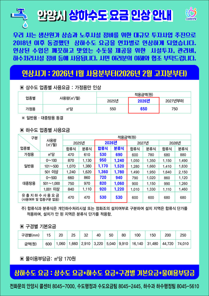 시는 2018년 이후 상수도 요금을 동결해왔지만, 지난 2024년 상수도 시설 개선과 안전한 수돗물 공급을 위해 2025년부터 3년간 단계적 인상 계획을 수립한 바 있다. 이에 따라 2025년 1㎥(톤)당 550원이었던 가정용 상수도 요금은 2026년 1월부터 650원으로 인상된다. 이번 인상은 가정용에 한정되며, 일반용과 대중탕용, 구경별 기본요금은 동결해 상업시설과 소상공인의 부담을 최소화한다.