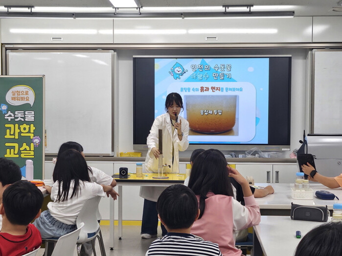 | 인천시 상수도사업본부가 운영 중인 인천하늘수 과학 교실 수돗물 정화 실험 장면 |