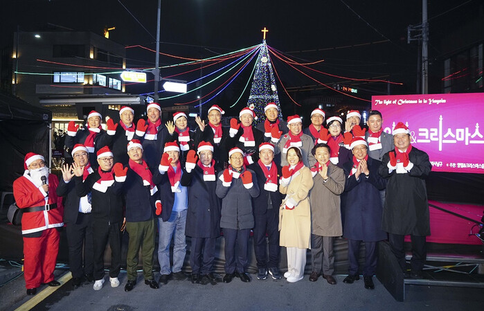 [광주=정찬남 기자] 강기정 광주광역시장(앞줄 오른 쪽부터 6번 째)이 2일 오후 남구 양림오거리에서 열린 2024년 양림&크리스마스 문화축제 성탄트리 점화식에 참석해 김병내 남구청장, 이정선 시교육감 등과 기념촬영을 하고 있다./광주광역시 제공