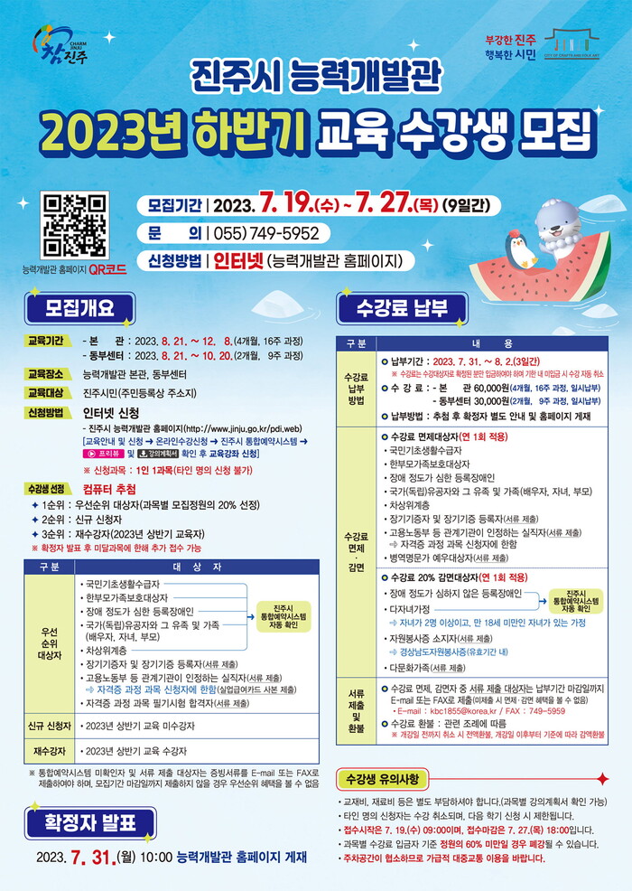 수강 신청은 진주시에 주민등록을 둔 시민이면 누구나 신청 가능하며, 능력개발관 홈페이지를 통해 온라인으로 신청하면 된다. 수강생 선발은 공정성을 기하기 위해 컴퓨터로 추첨해 확정한다. 수강 확정자 발표는 7월 31일 능력개발관 홈페이지와 SMS로 개별 통보할 예정이다.
