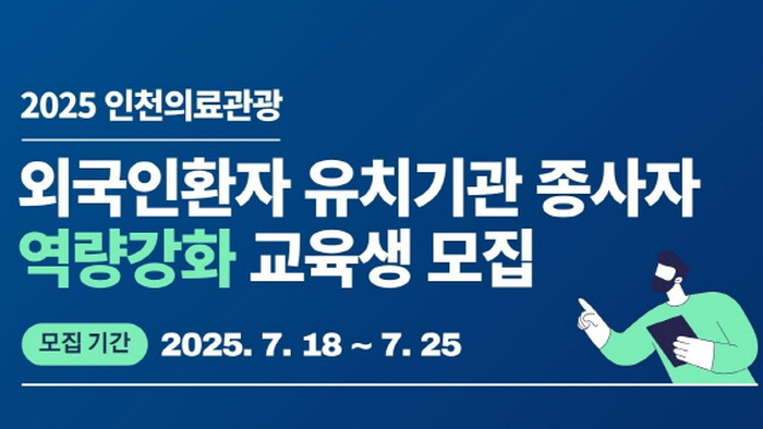 <인천 외국인환자 유치기관 종사자 역량 강화 교육>은 7월 29일부터 10월 28일까지 총 15시간 진행되며 인천 외국인 환자 유치기관 종사자를 대상으로 한다.