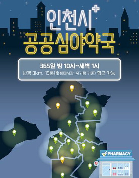 그동안 공공심야 약국이 운영되지 않아 불편이 제기됐던 검단·청라·연수 3개 지역에 5개소가 새롭게 지정돼 인천시민 누구나 반경 3km 안의 공공심야 약국을 15분 내에 이용할 수 있게 된다.