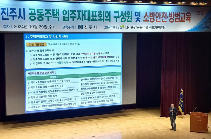 진주시는 지난 10월30일 LH본사 대강당에서 150세대 이상의 의무관리대상 공동주택 입주자대표회의 구성원 등을 대상으로 ‘2024년 공동주택 소방안전·방범 및 입주자대표회의 구성원 교육’을 실시했다.